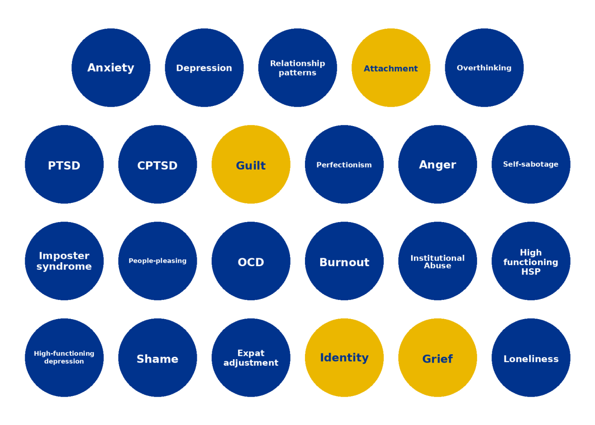Here with me you will find broad psychotherapy and coaching across a wide clinical range, not a practice built around one theme, one label, or one kind of suffering.
